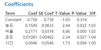 ºÐ¼®°á°ú, ¿¹Ãøº¯¼ö ³óµµ, ºñÀ², ¿Âµµ´Â P-°ªÀÌ 0.05º¸´Ù À۱⠶§¹®¿¡, À¯ÀÇÇÏ´Ù°í ÆÇÁ¤ÇÒ ¼ö ÀÖ´Ù.