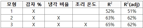 ¼¼ ¹øÂ° ¸ðÇüÀº Á¶¸® ¿Âµµ¸¦ Ãß°¡Çϸç, R2°ªÀº Áõ°¡ÇÏÁö¸¸ R-sq(adj)°ªÀº Áõ°¡ÇÏÁö ¾Ê´Â´Ù.