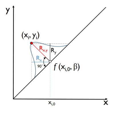 Á÷±³È¸±ÍºÐ¼®(Orthogonal regression)¿¡¼´Â µÎ °³ÀÇ °è·®Çü º¯¼ö, Áï ÇϳªÀÇ ¹ÝÀÀ º¯¼ö(Y)¿Í