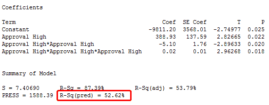 ¿¹Ãø R2(R-Sq Pred)Àº 0%¿¡¼ 100% »çÀÌ¿¡ ÀÖÀ¸¸ç PRESS Åë°è·®¿¡¼ °è»êµÈ´Ù.