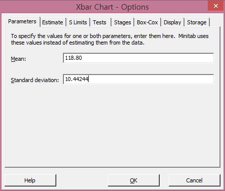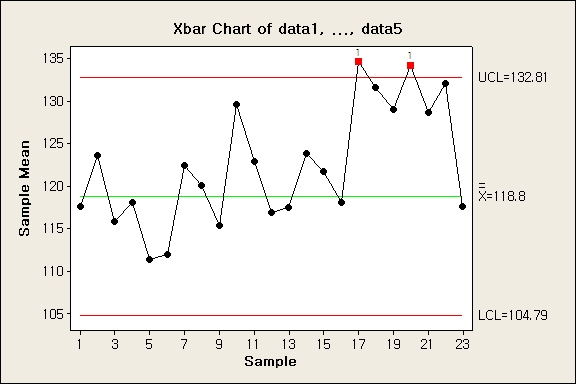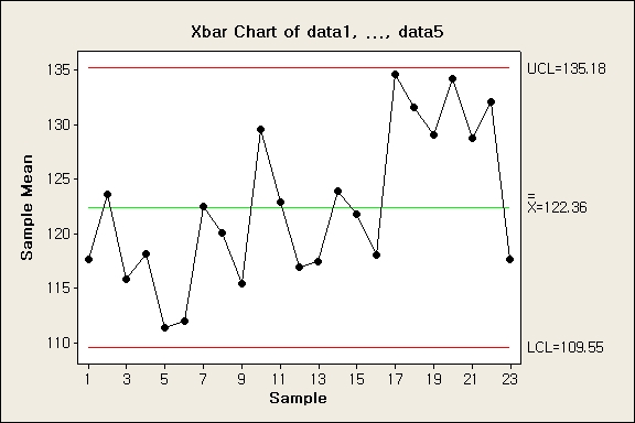 ¹æ¹ýÀº Á߽ɼ±(CL)=118.8, °ü¸®»óÇѰª(UCL)=132.81, °ü¸®ÇÏÇѰª(LCL)=104.78 °ªÀÌ Àû¿ëµÇµµ·Ï Æò±Õ°ª°ú