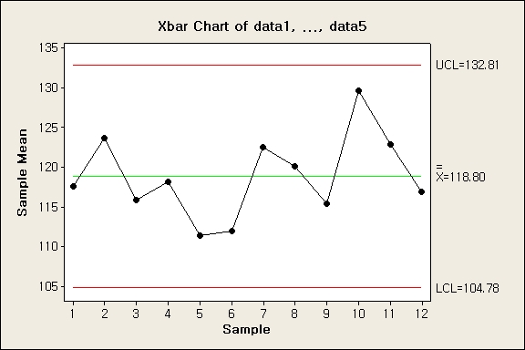 12°³ÀÇ ºÎºÐ±º(Subgroup)À» ±â¹ÝÀ¸·Î Á߽ɼ±(CL)=118.8, °ü¸®»óÇѰª(UCL)=132.81, °ü