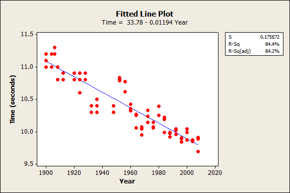 R-Sq°ª 84.4%ÇÏ¿¡¼ ºÐ¼®µÈ ȸ±Í½Ä Time = 33.78 - 0.01194 YearÀ» ±âÁØÀ¸·Î º¸¸é