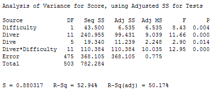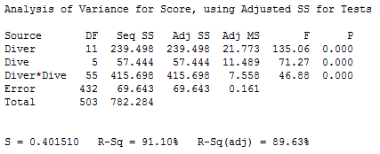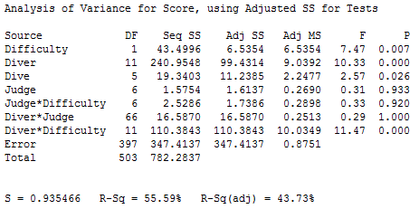 General Linear ModelÀ» ÀÌ¿ëÇÏ¿© ¹ÝÀÀ°á°ú·Î ÆÇÁ¤Á¡¼öÀÎ Score, ¿¹Ãøº¯¼ö·Î¼ Difficulty, Diver, Dive, Judge, Difficulty¿Í ±³¶ôµÇ´Â Diver*Dive¸¦ Á¦¿ÜÇÑ ¸ðµç 2Â÷ ±³È£ÀÛ¿ëÇ×À» »ç¿ëÇÑ´Ù