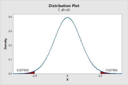 °ËÁ¤ °á°ú t-value(t-°ª)´Â 2.5·Î ºÐ¼®µÇ¾ú°í À̶§ ÀÚÀ¯µµ°¡ (n-1 = 49)ÀÎ t-ºÐÆ÷¿¡¼ ÀÌ t-value=2.5´Â